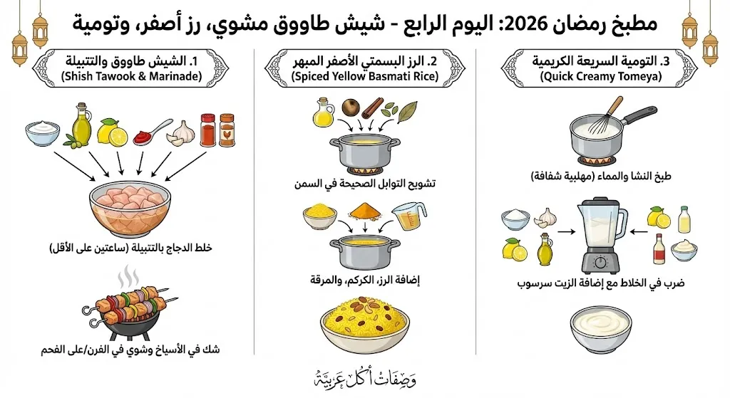 النهاردة هنعمل “جو مطاعم” في البيت. هنعمل “شيش طاووق مشوي” بتتبيلة سرية بتخليه طري جداً وجوسي ومبينشفش أبداً، وهنقدم جنبه “رز بسمتي أصفر” مفلفل وريحته تجيب لآخر الشارع، وطبعاً ميكملش من غير “سلطة التومية” الكريمي الخطيرة.