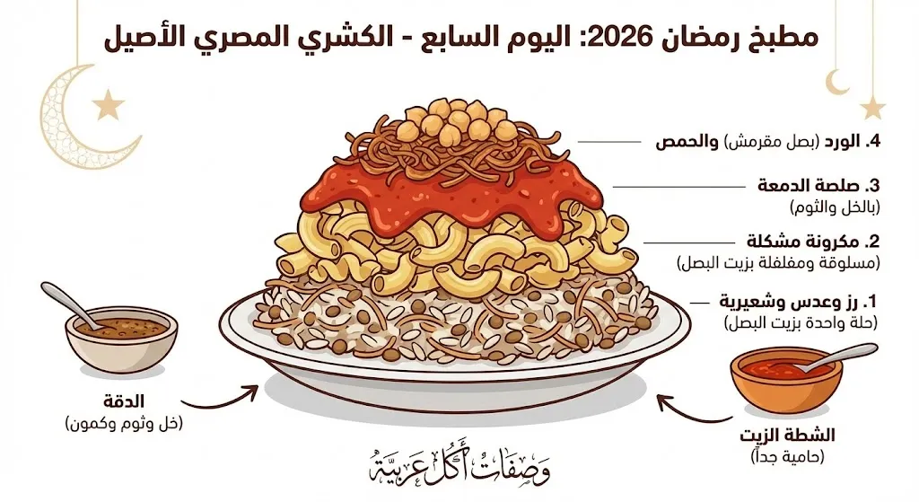 فطار سابع يوم: الكشري المصري الأصيل بكل تكاته.. “طبق السعادة” اللي ميتشبعش منه!